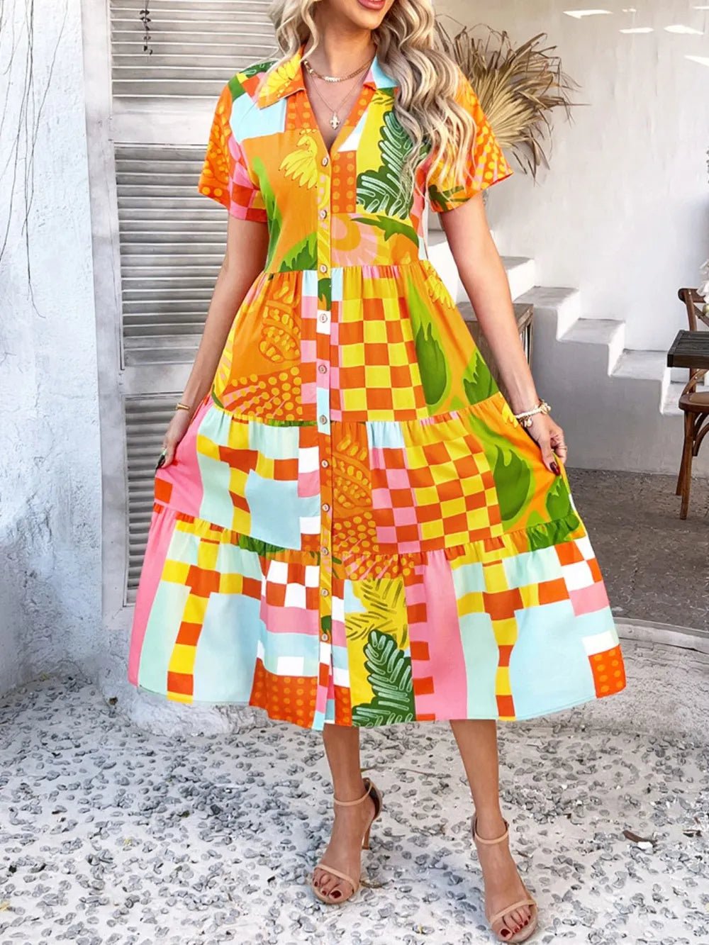 Devine Printed Johnny Collar Button Down Short Sleeve Midi Shirt Dress