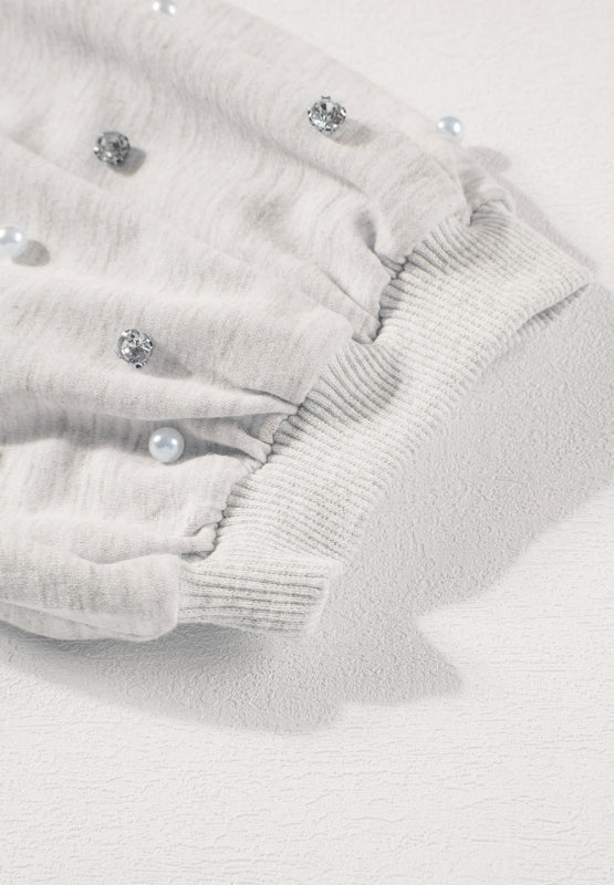 Rhinestone Pearl Detail Round Neck Puff Sleeve Top